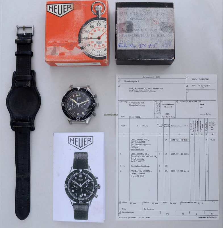 Watch #1 — Full set with Heuer orange box, military black box, Anlagenblatt AAN document with matching NATO number 6645-12-146-3774, 3H red dial, 4-digit serial (3997), 1969, unpolished case.